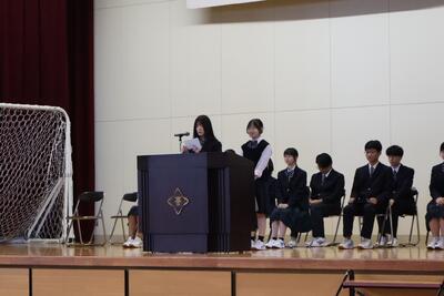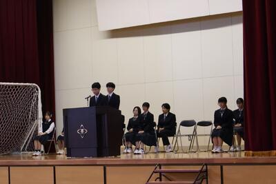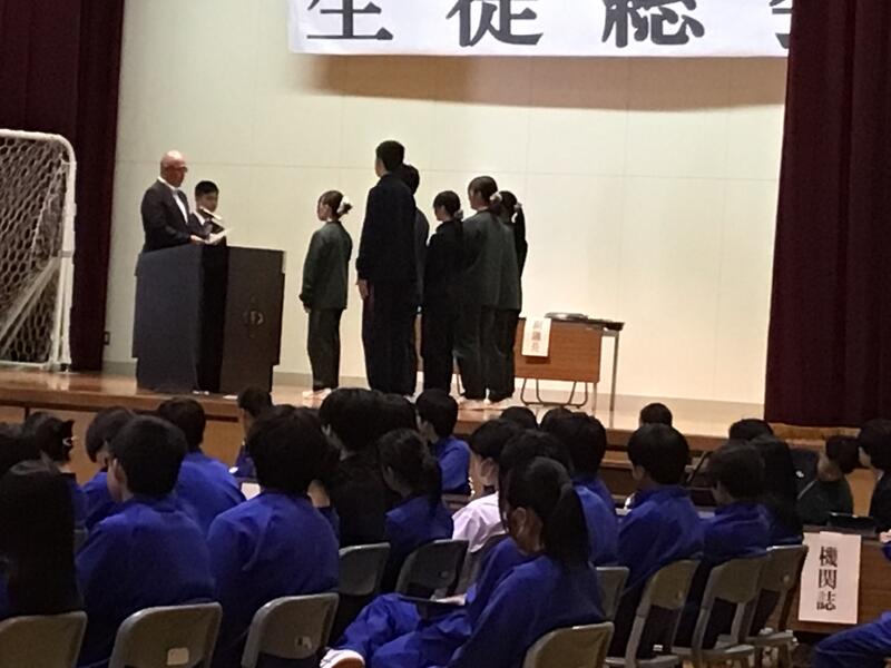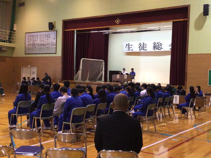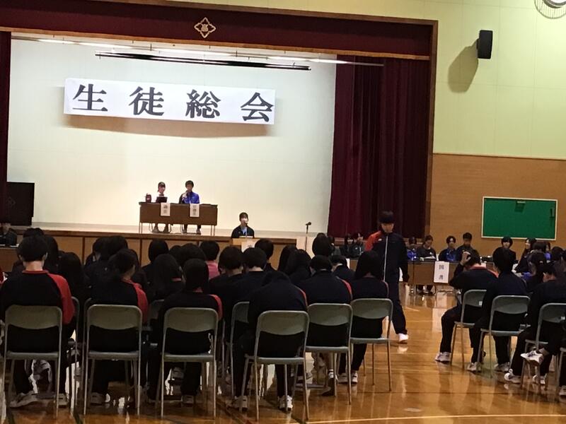9月26日(金)後期生徒総会が行われました。生徒会の前期の活動報告の反省の後、後期の生徒会役員の認証式が行われました。その後、後期の生徒会活動の活動方針や目標が報告されました。生徒が自分たちでよりよい学校を作っていくために意見を出し合う大切なものです。後期の生徒会役員のみなさん期待しています。
