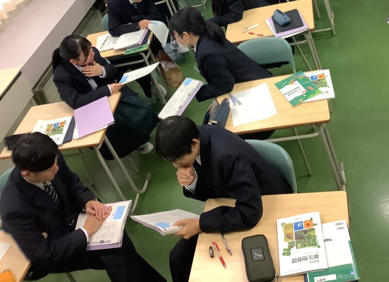 まず始めに遺伝子などの基礎知識について復習した上で、各自が資料を元に、まとめたことをチームで共有する作業を行っています。学ぶ過程で、情報を分析することや、他者と協働すること、相手の立場に立って考えることをねらいとして学びを深めています。次の時間は調べたことを元にチームを解体して、別のグループに組み直して話し合いを深めていく予定です。