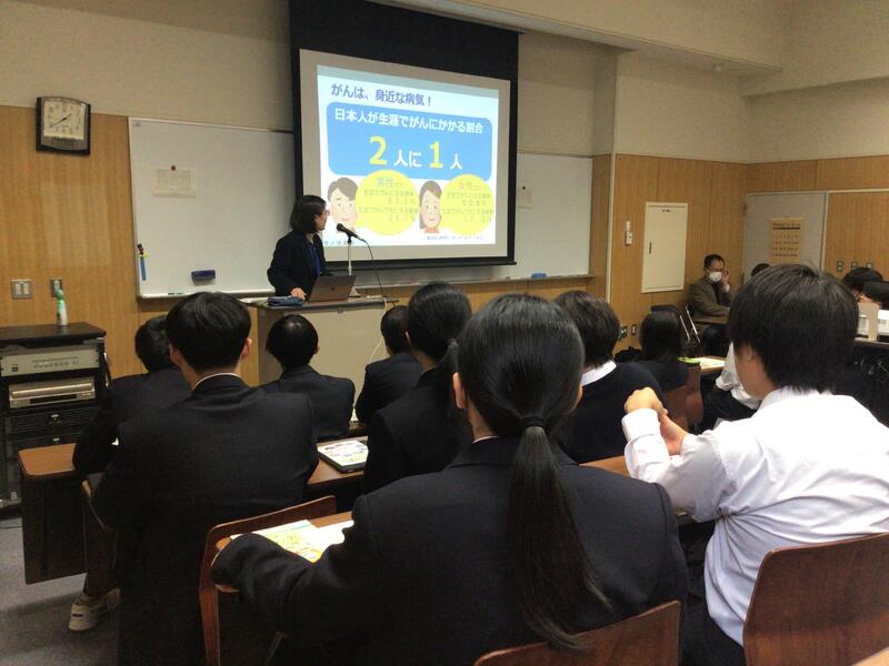 11月10日(月)5・6校時に1学年を対象とし、「がん教育」授業を実施しました。保健師、がん患者・家族の支援会代表、がん経験者の方々をゲストティーチャーとしてお招きし、がんについての知識や現状を学ぶとともに、がん患者の方からのお話を聞きました。授業を通じて、自他の健康といのちの大切さを知り、共に生きる社会づくりを目指す態度を育成する 貴重な機会となりました。